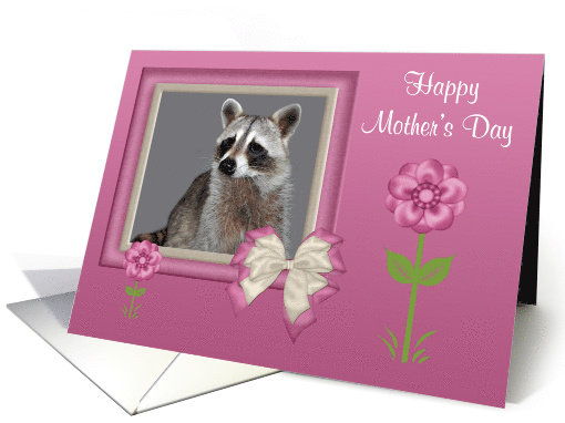 A portrait of a beautiful raccoon set in a elegant frame with a pretty bow attached in the corner makes for a lovely general Mother's Day card that will work for any mother on her special day. The background is light with delicate flowers with stems.