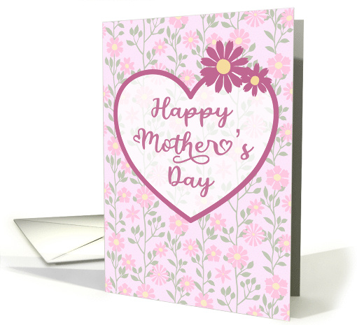 Large heart surrounded by garden vines with pink flowers. Script cursive typeface says “Happy Mother’s Day”