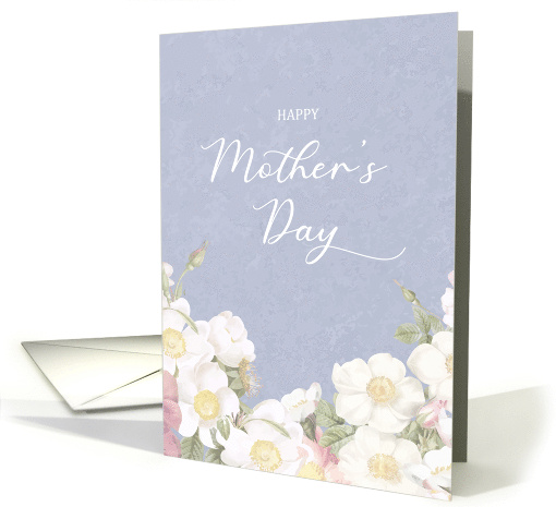 A blue and white Mother's Day card with white flowers arranged at the bottom to give off elegant vibes. With the text in cursive to match the visual vibes.
