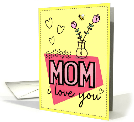 Celebrate Mom with this charming Mother’s Day card, bursting with love and joy! Featuring a cheerful pastel yellow background, hand-drawn pink roses in a vase, playful hearts, and a buzzing little bee, this card is designed to make her smile. Bold lettering puts focus on “MOM”, with the heartfelt message “I love you” in handwritten font script beneath it — perfect for expressing just how much mom means to you.