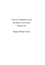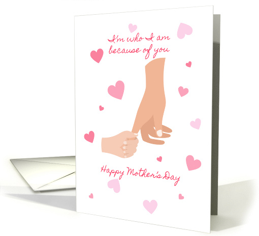Celebrate the beautiful bond between a mother and child with this heartfelt Mother’s Day card. Featuring a tender illustration of a small hand holding onto a mother’s finger, surrounded by soft pink hearts, this card captures the essence of love, guidance, and gratitude. The message, “I’m who I am because of you,” paired with “Happy Mother’s Day,” expresses the deep appreciation we feel for the women who shaped our lives. This is perfect for moms, stepmoms, grandmas, or mother figures who made a lasting impact.