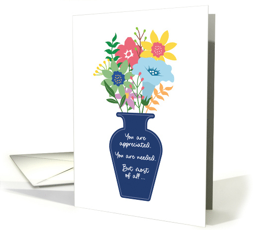 Mother's day graphic style flat color illustration of various wild flowers in a vase with the words, you are appreciated, you are needed and but most of all ... you are loved.