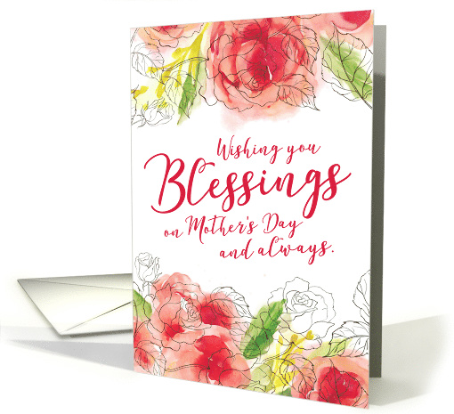Wish someone a happy Mother's Day while reminding them how special they are to you with this elegant calligraphy typography design, featuring the message "Wishing you Blessings on Mother's Day and always." Background includes dark pink watercolor roses. Inside can be customized with your own message.