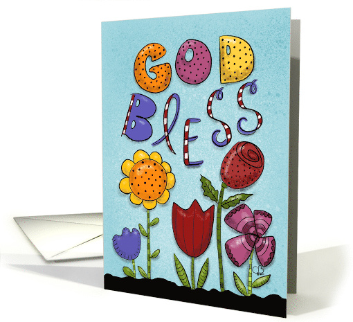 ©Christie Black. Some whimsical, colorful, patterned flowers planted in a flower bed against a blue sky. The words, God Bless is in a handwritten whimsical font. This greeting for a Happy Mother's Day, can be used for anyone or any reason that is fitting for you.