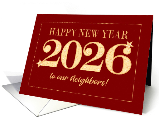 A stylish greeting card for the new year, 2026, for your neigbors with gold-effect lettering on a deep red background. The front cover greeting is, 'HAPPY NEW YEAR 2026 to our Neighbors!'. The number, 2026, is filled with gold-effect stars of various sizes, on a lighter background and there are larger stars at the foot of the first '2' and at the top of the '6', all framed by a border of tiny, gold-effect dots. You can easily change the inside message if you wish or delete it completely.