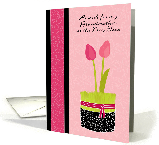 Two pretty tulips surrounded by wheat grass to celebrate the new year. A fun and colorful card in pink, with the modern twist of black on the flower pot and side stripe. Please feel free to add to, or change, the suggested inside text.