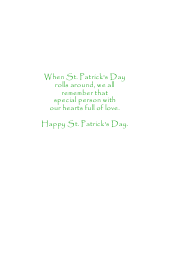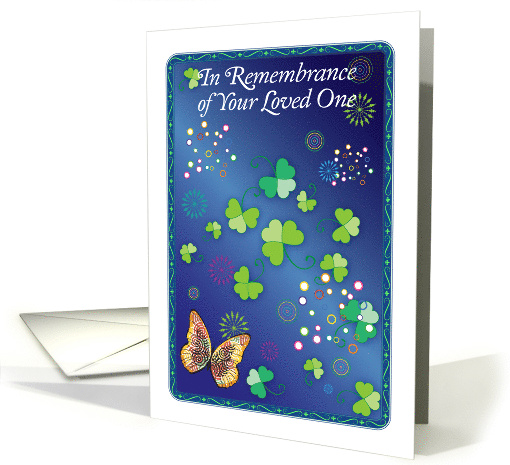 If St. Patrick's Day reminds you of a lost loved one, give this card to show you care. The cover features a gradient blue background, crisp white border, with sprinkles of designs and shamrocks falling. In the left corner is a symbolic butterfly. The inside verse may be changed, if you wish.©Gail Pepin