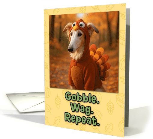 This charming Thanksgiving card shows a dog dressed in an orange turkey costume with a hood featuring googly eyes, an orange beak, and red wattle. The pup wears matching orange turkey "wings" and sits against a dreamy autumn forest backdrop with warm golden tones. The card has a soft yellow border decorated with delicate leaf patterns. The text reads "Gobble. Wag. Repeat." in playful green letters with black outlines, perfectly capturing the joy of dogs during the holiday season. It's an irresistibly cute card that combines Thanksgiving spirit with puppy charm.