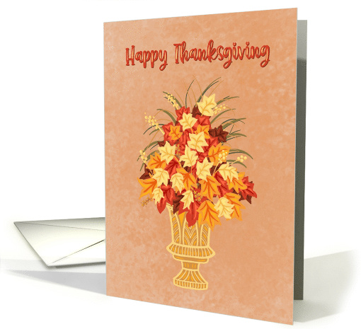 A festive Thanksgiving card featuring a golden vase overflowing with fall leaves in shades of orange, yellow, and red. with the phrase “Happy Thanksgiving.” A warm way to share holiday blessings with loved ones.