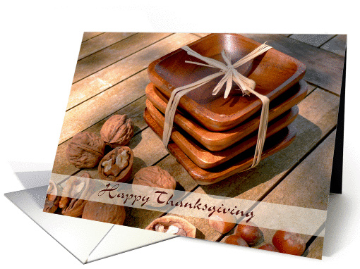 Happy Thanksgiving Harvest Holiday photography card in brown autumn colors with wooden bowls, walnuts and hazelnuts by ZenzCards