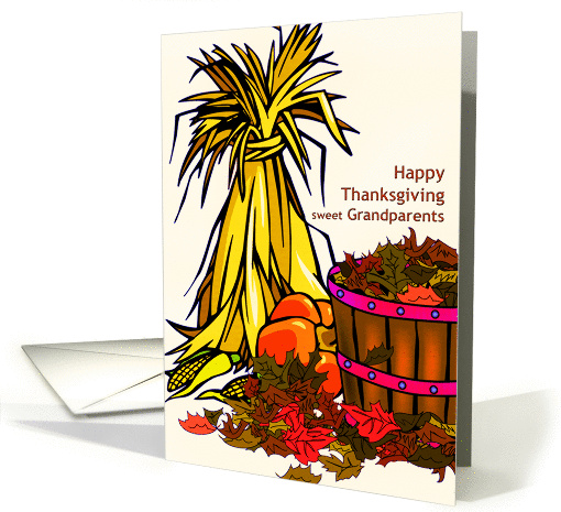Tall golden Corn stalks with pumpkins and a crate barrel basket trimmed in colorful bands filled with autumn fall leaves and more leaves falling onto the ground are featured in this Holiday card. A soft pastel tint of peach in the background. Bright + cheerful. em me if you need assist customizing.