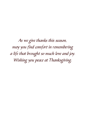 A gentle and comforting Thanksgiving design featuring pumpkins, sunflowers, and softly painted autumn leaves. Created to honor loved ones remembered during the holiday season, it conveys warmth, reflection, and gratitude for the memories that endure. Perfect for sending comfort and support to someone who is missing a loved one this Thanksgiving.