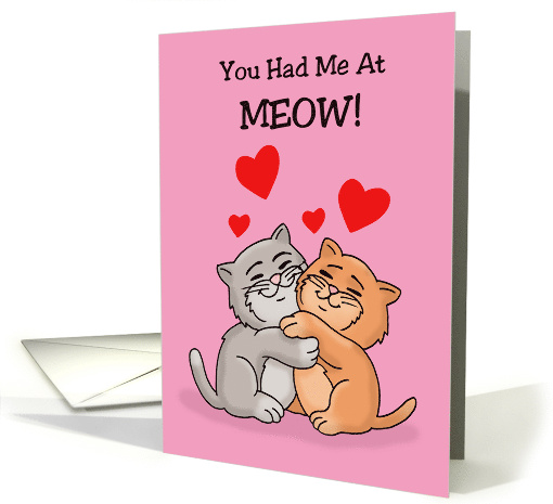 Cute Valentine Card, with two cartoon cats hugging on a pink background. The words say: You had me at meow! Inside says: Happy Valentine's Day! (You can find more of my cards at: http://www.greetingcarduniverse.com/laughinghippostudio)