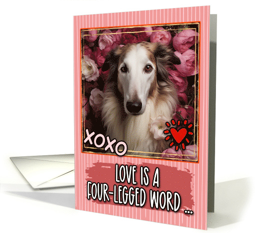 Love and kisses from this super cute borzoi posing amongst a giant bouquet of pink and red roses on a pink striped background with a gold colored trim and the text "Love is a four-legged word..." A sweet card to send to a borzoi mom or dad, a breeder, a dog shelter, or just any dog person for Valentine's Day.