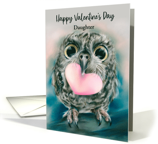 A delightful little owl with big eyes and brown feathers is pictured on the cover of this Valentine’s Day greeting as it holds a pink heart in its beak. The bird artwork is done in soft pastel shades. Text may be customized for your daughter or for anyone.