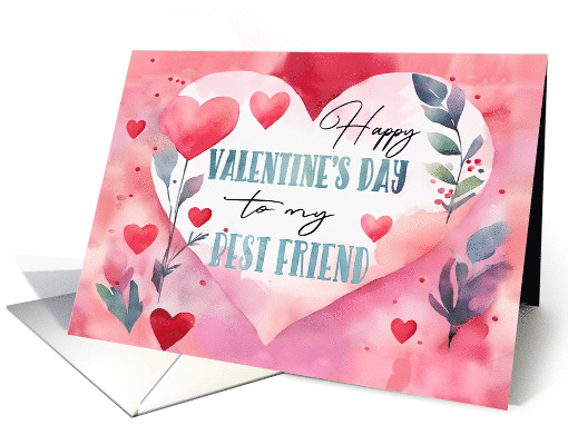 Watercolor wash of different hearts and leaves in shades of red, pink and blue, wishes a best friend a happy Valentine's Day.