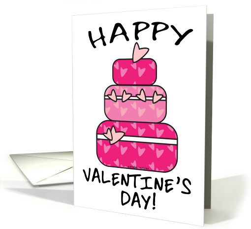 Happy Valentine's Day card with illustration of pink hearts layer cake.