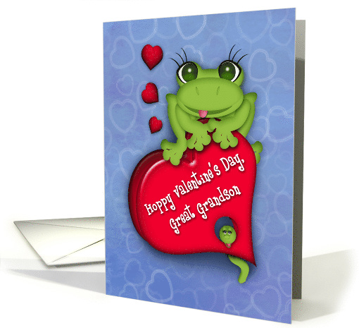 An adorable green frog sitting on top of a heart shaped candy box with a cute little green worm coming out of a hole. On a periwinkle background with white hearts. Heart reads "Hoppy Valentine's Day, Great Grandson. Inside reads. To the sweetest little boy! We love you! Inside message my be changed by you.