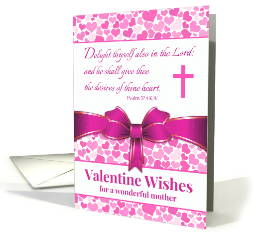 Valentine Wishes for a wonderful mother. Valentine's Day greeting card for a mother / mom. Christian themed card with Bible scripture verse from Psalm 37:4 (KJV). A small cross and large bow with small pink shaded hearts filling in the top and bottom of the design.
