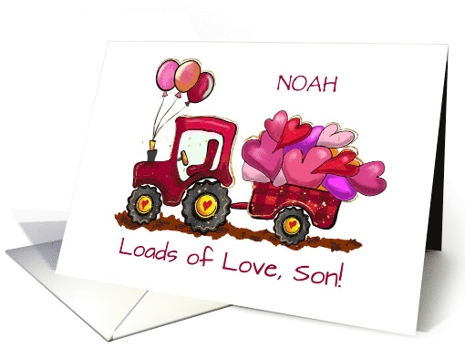 Personalize your Valentine’s Day message for your son with a delightful card featuring a tractor hauling a wagon of pink hearts and three balloons floating from the front. Customizing the name on the front adds an extra special touch to this heartfelt and playful design.