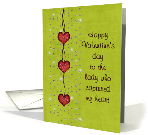 A background in a chartreuse green with faux diamond look - rhinestone - Bling frames 3 dangling hearts on a string - all in a faux red glitter - sparkle look boasting I love you for a Wife on Valentine's day.