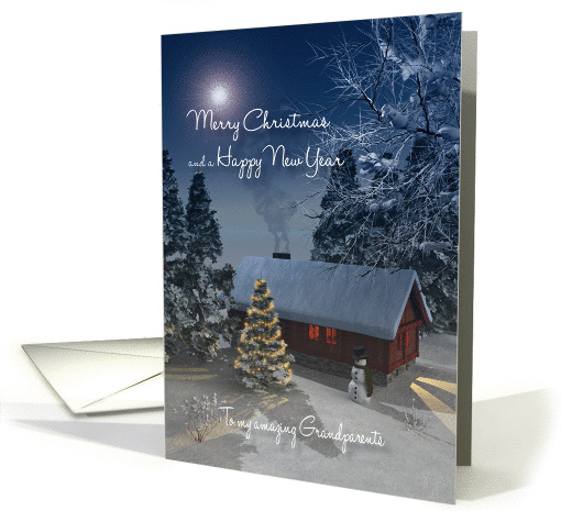 A whimsical fantasy Christmas card for your Grandparents. An attractively snowscene with a cottage, Christmas tree and a snowman . Inside there is a text which you can customize to something very personal.