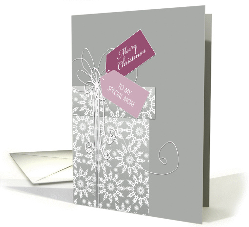 Send stylish Christmas wishes to your mom with this contemporary Christmas card.This elegant card features a present or gift (wrapped in grey gift wrap paper with white snowflakes) white swirly ribbon and tags. You can edit text inside card yourself