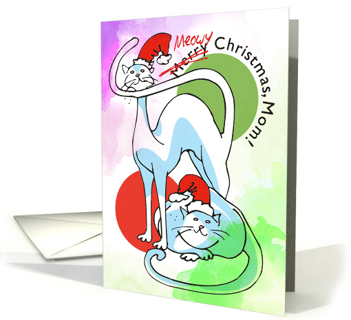Meowy Christmas, Mom! From the cats. A couple of cats in Santa hats. Inside reads, Deck the halls with balls of catnip, fa-la-la-la-la, la-la-la-la Meowy Christmas! Just the card they've been looking for - for Mom this Christmas!