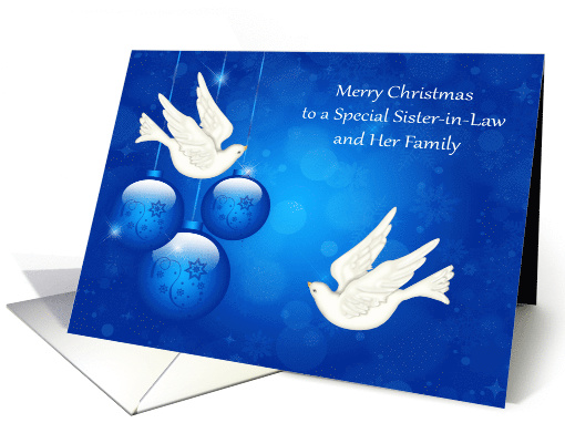Wish your wonderful sister-in-law and her family a Merry Christmas with a card featuring a beautiful blue background with Christmas Bulbs, stars, ribbons, and white doves. FYI: From a wedding release to a memorial tribute, doves are commonly incorporated into events, sending a message of peace, love, and hope. Scientists have found the anatomy of doves is very different from that of other birds. In fact, these beloved birds have no gallbladder, an organ that typically secretes bile. Instead, they secrete it directly into their gut. They are some of the strongest fliers of any bird species. With their large wings and strong muscles, they have developed strength in flight and great ability to perform maneuvers. Original design by Laurie Schneider, elements by Digital Designs by Elena, Diana'z Designz