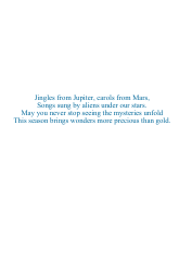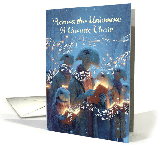 This peaceful card explores the idea that there could be extraterrestrial beings tuned in to our customs and possibly singing carols.