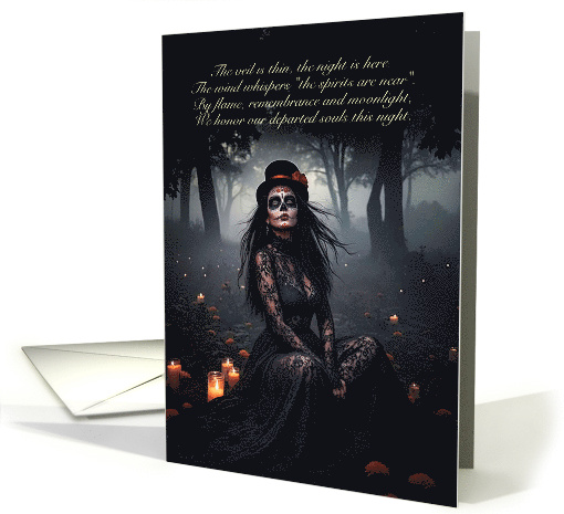 Dia de los Muertos card with an enchanting woman in a night setting with candles and marigolds. A bit mystical, in an outdoor setting, she sits, in the silence of the night, in honor of all those loved ones that have departed.