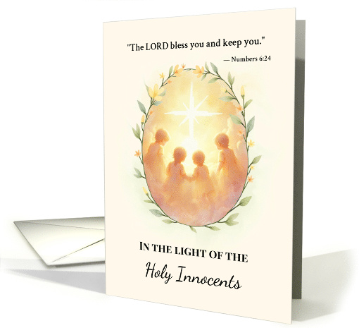 This gentle design honors the Holy Innocents—those baby boys who lost their lives at the time of Christ’s birth and who now rest in heaven’s eternal light. A soft watercolor scene of young children gathered before a glowing cross is framed in a peaceful green wreath, evoking prayer, reverence, and dignity. Though the Feast of the Holy Innocents is observed on December 28, this card can be shared any time of year as a spiritual gesture of remembrance, encouragement, or pro-life support. Appropriate for pregnancy loss, miscarriage, memorial, or those reflecting on the sacredness of life. See more designs from Sandra Rose Designs at: