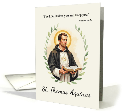 This peaceful image of Saint Thomas Aquinas features the Dominican saint holding an open Bible, dressed in his traditional habit, with a golden sunburst over his heart. The scripture quote from Numbers 6:24 offers a blessing of divine peace and protection, inspired by his enduring legacy of faith and wisdom. Although his feast day is celebrated on January 28, this card is appropriate for all occasions—offering encouragement, spiritual support, or simply a reminder of God’s peace. A soft watercolor wreath surrounds the portrait, giving it a timeless and gentle touch.
