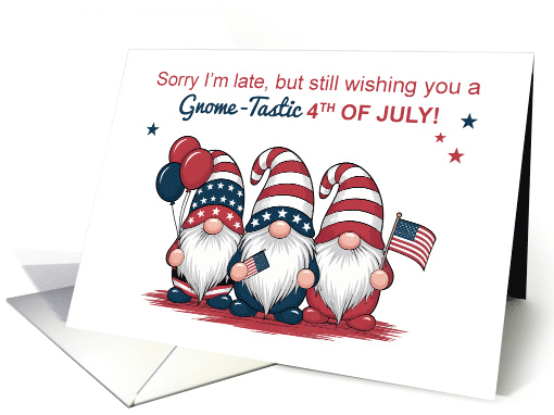 Even if the fireworks have faded, the good wishes haven’t! This cheerful belated 4th of July card features three patriotic gnomes in festive stars and stripes, still celebrating in style. A fun way to say you're thinking of them—even if it’s a little late. The message inside keeps the spirit alive with warmth and charm.