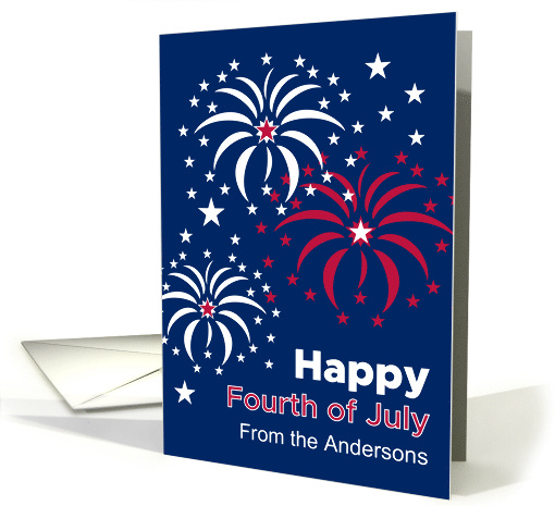 Send an Independence Day greeting from your family with a personal touch with this easily customizable 4th of July card. The clean, modern design features graphic fireworks and stars in a red, white and blue patriotic color scheme.