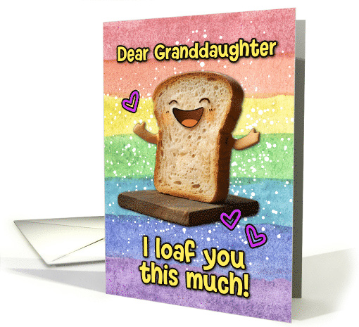 A cute loaf of bread with it's arms wide on a rainbow watercolor background with splatter effect and the text 'dear granddaughter I loaf you this much!'. Perfect fun design to send to your queer granddaughter for Pride Month.