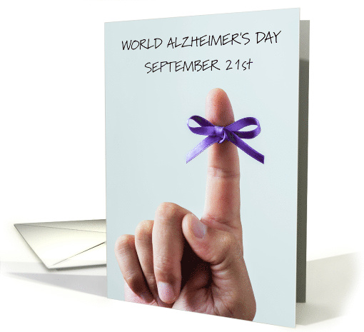 A close up photograph of a hand with one finger pointing upwards. There is a purple ribbon tied in a bow around the finger which is pointing upwards. The image is accompanied by the words 'World Alzheimer's Day September 21st'.