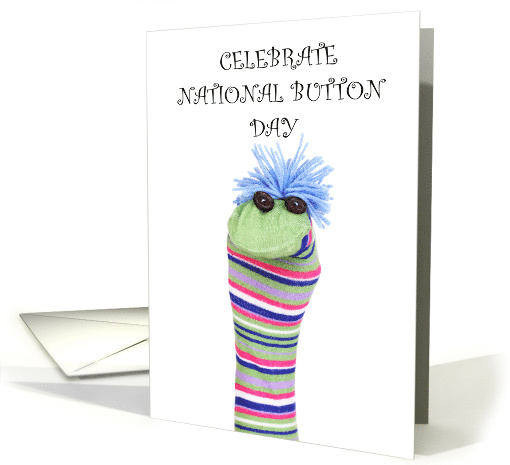 A photograph of a multi colored, striped sock puppet with a pale blue wool pom pom hairstyle and two button eyes. The image has a crisp white background and is accompanied by the words 'Celebrate National Button Day'.