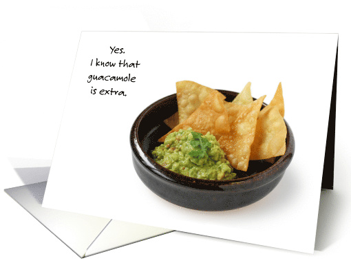 Avocado fans know that they can be expensive and at a well known build your own Mexican mean fast food restaurant, guacamole is usually an extra charge, but worth it because it is extra special and delicious! Send this card featuring a dish of tortilla chips and guacamole to a guac fan to celebrate National Guacamole Day on September 16th. If we're lucky it won't be an extra change on that day.