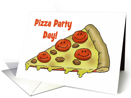 Cute National Pizza Party Day With a Cartoon Pizza with Smiling Pepperoni and sausage along with dripping cheese. The words say Pizza Party Day. Inside says, Who doesn't like pizza? So let's have a party!