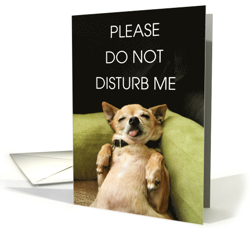 A cute photographic image of a chihuahua lying back sleeping with his tongue hanging out. The words 'Please do not disturb me' accompany the image.