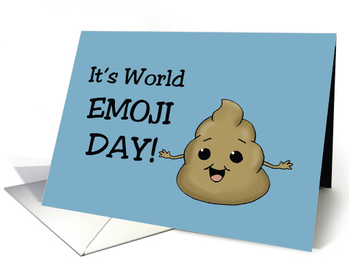 World Emoji Day (July 17th) Card with a cute "poop" emoji drawing. Inside says, Celebrating the humble emoji. We use emojis to let others know how we feel or to spread joy.