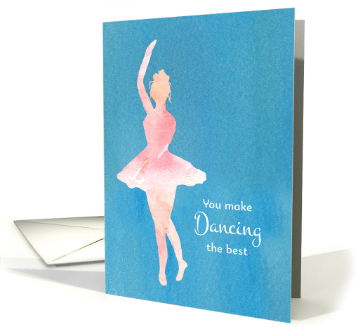 You make dancing the best greeting card for a special dance instructor on Dance Teacher Appreciation Day decorated with a pink ballerina in a pose illustrated with watercolor on a peacock blue watercolor wash background.