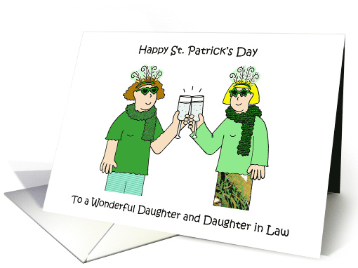 A cute card to celebrate St. Patrick's Day, for any much loved Daughter and Daughter in Law. A couple of women dressed in funky green outfits are toasting each other with glasses of champagne.