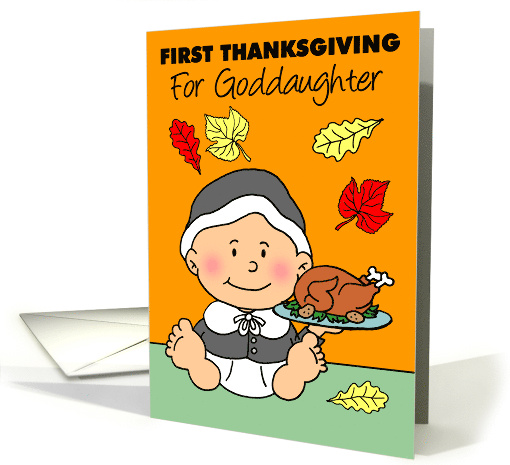 Goddaughter's First Thanksgiving featuring a cute, cartoon baby pilgrim. The baby girl is holding a turkey and sits against an orange background. Falling, colorful leaves surround her. A cute design for a newborn Goddaughter on Thanksgiving.