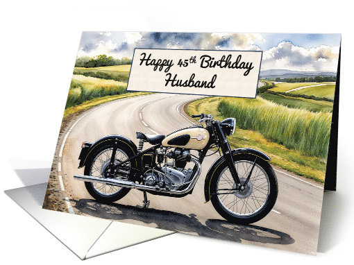 Celebrate your husband’s 45th birthday with this timeless motorbike card, symbolising wisdom, quiet confidence, and the depth of love you share. A cream and black motorcycle rests at the bend of a tranquil country road, golden grasses gently moving beneath a serene, softly painted sky. The hand-lettered “Happy 45th Birthday” completes the scene with elegance. This card is a tribute to a husband who has grown stronger and more grounded with every year—someone you deeply admire and continue to love more with each chapter of the journey.