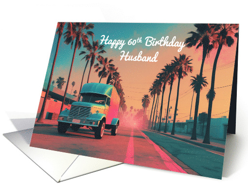 Happy 60th Birthday Husband A stunning retro-style digital artwork features a beautifully restored vintage truck cruising down a palm-lined boulevard under a mesmerizing sunset. The sky transitions from deep teal to warm orange, setting a dreamy atmosphere. The truck, painted in a striking neon turquoise and magenta gradient, gleams under the fading light. A pink road marking extends toward the horizon, leading to a misty vanishing point that enhances the surreal aesthetic. Towering palm trees cast elongated shadows, while overhead power lines add an urban touch. The elegant, cursive "Happy 60th Birthday Husband" text sits gracefully in the sky, blending seamlessly with the nostalgic yet futuristic ambiance of this modern concept pop art piece.