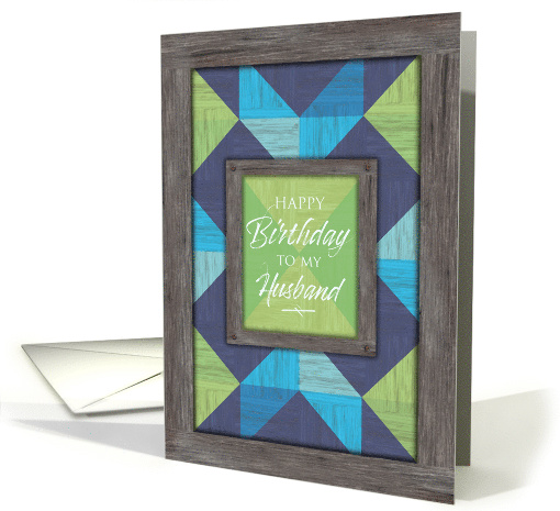 This birthday card, for a husband, has a rustic style with a green and blue color scheme. It’s bordered by a dark gray wood-effect frame that lends a polished yet aged look. The background features a barn quilt-inspired design, composed of colorful geometric shapes arranged in a patchwork pattern. Centered within is a smaller matching frame, displaying the words “Happy Birthday to My Husband” in an elegant mix of white cursive and print font, placed on a light green rectangular panel that pops against the patterned backdrop. The card’s overall vibe merges rustic appeal with a classic, enduring feel. This card comes with the “matte finish” selected for a more rustic feel. ©Holli Conger