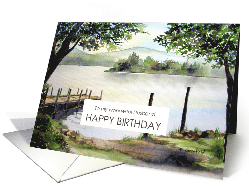 Delight someone special with this exquisite greeting card showcasing a watercolor painting by myself, Farida Greenfield. The artwork captures the breathtaking scenery of Derwenwater Lake near Keswick in the Lake District North of England during a peaceful summer day. The tranquil view of the lake, misty hills, and lush green trees creates a calming and inviting atmosphere, making it a perfect card to send warm thoughts and well wishes. The card design is for Husband on Birthday.
