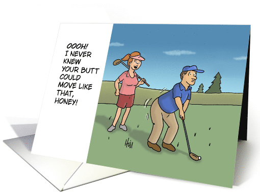 Humorous Golf Theme Birthday Card for a husband, with a cartoon showing a couple on the golf course. The words say: Oooh! I never knew your butt could move like that, honey! Inside says: Happy Birthday, Husband